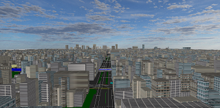 スカイボックスを追加し、ビルにテクスチャを貼り付けてみた。リアルとは言えないが、雰囲気は出てきた。