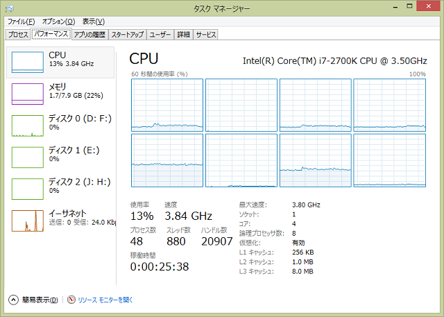 overheadも考慮すると実に90%を超えている。でもPC全体のCPU負荷をみると15%程度となっていた。マルチコアでうまく処理されているようだ。